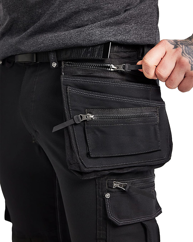 The material is a smooth 4-way stretch fabric which is both strong and stretchable in all directions. The trousers have advanced details and practical pockets with CORDURA® reinforcement, a leg pocket with a zip and bellows, a folding ruler pocket, front pockets and functional tool holders, for example loops to hold hammers.